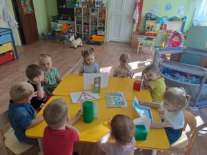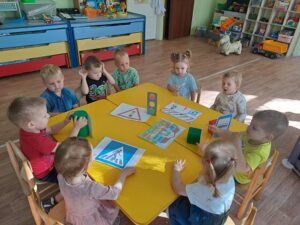 Дети познакомились со Светофором: учились понимать сигналы — красный, желтый и зелёный и применять их в игре, в жизни, знакомились со знаками дорожного движения. Поиграли в интересную игру «Автобус»:кто-то был водителем, а кто-то пассажирами.